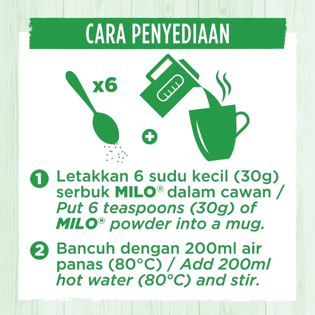 • Pek 1.8kg menghasilkan kira-kira 60 cawan MILO® dengan 30g setiap hidangan